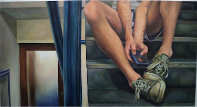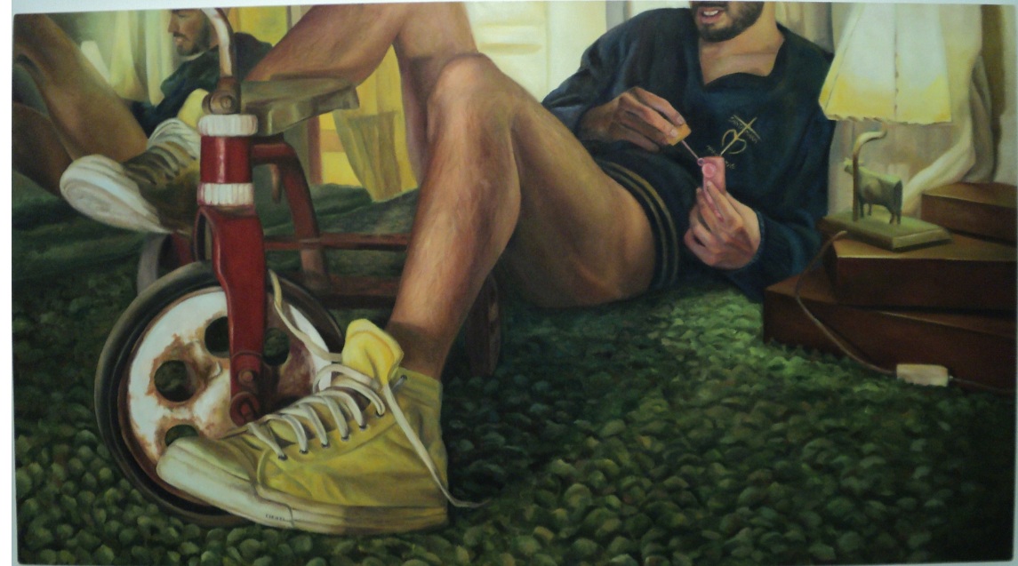 Miró Quesada focuses on the male body and keeps faces veiled or fully hidden. In the first painting a couple of hands grab (almost grope) an electronic gadget. In the second one, we’re privy to quite an interesting voyeuristic exercise. The third painting is very erotic, and its energy resides precisely in that which we cannot see, thus the refusal to reveal nothing but a couple of arms ignites the viewer’s imagination.