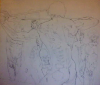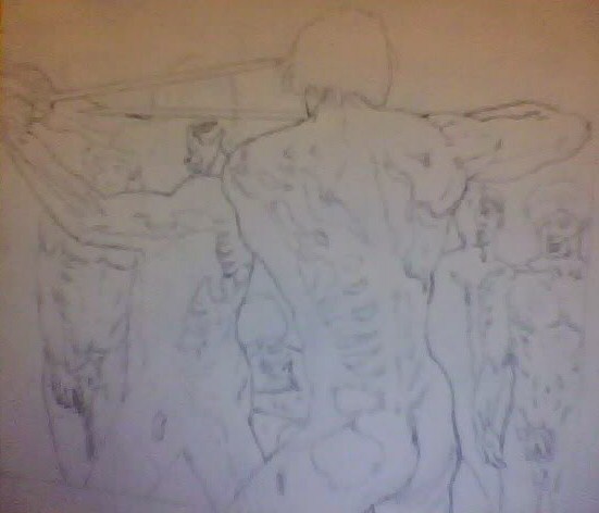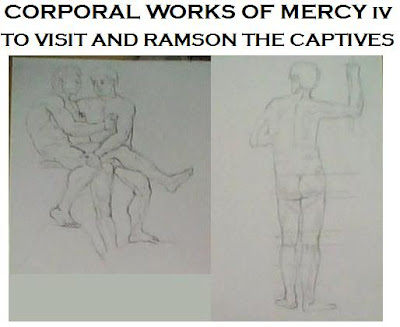 Y con tanto erotismo en mente, quisiera pensar que mi siguiente dibujo conserva algo de interés en ese aspecto. También fue realizado a pedido, y es parte de la serie dedicada a las obras de misericordia. Si el primero se trataba de “darle de beber al sediento”, este busca “redimir al cautivo”. Tinta china y plumilla sobre un esbozo inicial a lápiz (que también adjunto aunque en baja resolución).