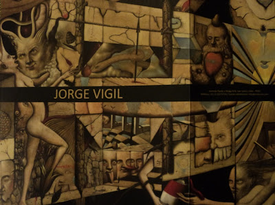 El día martes fue la inauguración de la muestra de Jorge Vigil en la Galería Enlace. Por suerte llegué temprano y pude observar detenidamente cada uno de los cuadros, y me parecieron fascinantes. Por momentos Vigil es abstracto pero conjuga simultáneamente el surrealismo y la capacidad pictórica de la ilustración. Su trabajo es minucioso, detallista, perfeccionista. Además del dominio absoluto del color, su trabajo a lápiz es extraordinario. Se trata de un artista que sería capaz de resaltar solamente con una hoja y un simple lápiz de grafito. Un verdadero maestro.