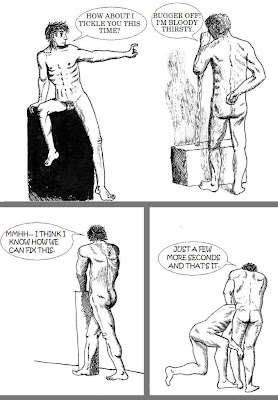 El tercer cuadro es sumamente sugerente, tiene una gran fuerza erótica y su energía reside precisamente en aquello que oculta, en lo que se niega a revelar. El espectador tan sólo atisba el movimiento agitado de dos pares de brazos, y eso es más que suficiente para encender la chispa de la imaginación (tampoco es gratuita la ubicación del patito de hule).