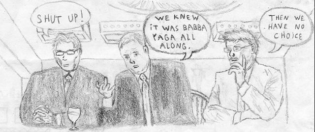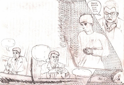 The next drawing has several characters that while sharing the same space are still a bit too disconnected from each other, thus proving that it's not enough to pour in lots of people, you have to make it look like they're all there interacting.