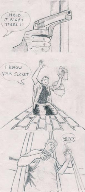 Este es uno de mis primeros intentos de hacer un cómic... Alguien me preguntó qué pasaba a continuación, cuál era el "secreto". Por supuesto, no había ningún secreto ni nada. Aún así me divertí al observar la curiosidad de otros por algo que, claramente, era un simple ejercicio de imágenes.