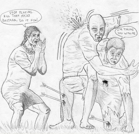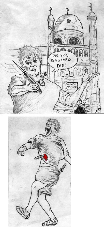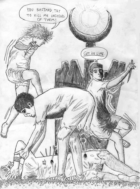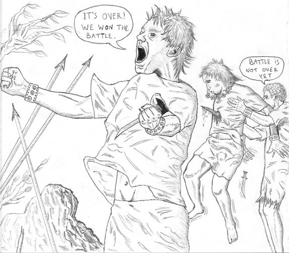 Aquí hay uno de mis favoritos. Un montón de gente apunto de atacar a dos indefensos sujetos. Y de alguna manera el resultado final es bastante aceptable. El boceto original fue hecho con lápiz 2B. Y luego un amigo de ByrneRobotics.com se entusiasmó tanto que decidió pasarlo a tinta. Hay obvias diferencias entre las dos versiones. ¿Cuál es mejor? ¿La versión a lápiz o la entintada?