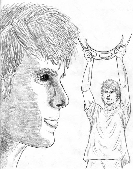 Luego intenté crear a un personaje de aspecto singular y extraño. Los que han estudiado griego podrán darse cuenta que lo que dice está escrito correctamente, excepto que se trata de una palabra que no existe. Ambos bocetos fueron realizados, como siempre, con un lápiz 2B.