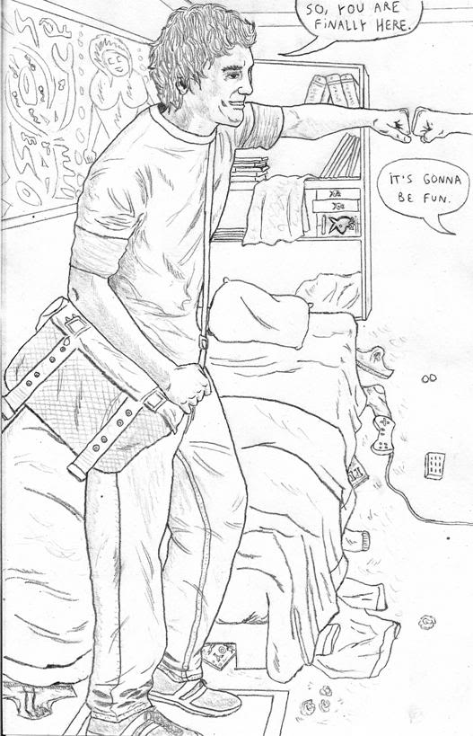 Mi intención era dibujar fondos, algún tipo de escenario, pero al final lo dejé tal como está. Lápiz 2B.