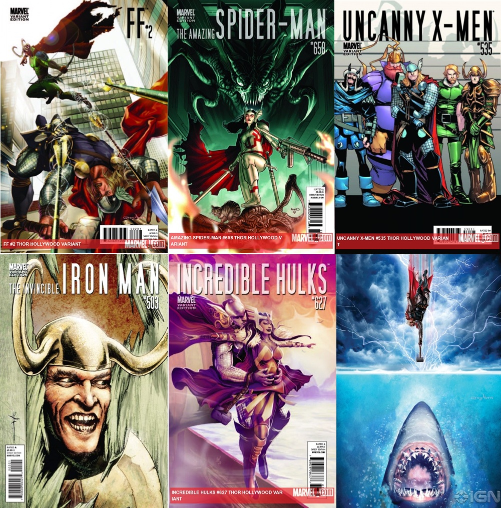 Just for fun I’m including a couple of talking heads of my own, a scan page of the first Thor issue (a fine example of how expository this 60s comics used to be: when Donald Blake trips he has to make clear to the reader he has tripped by saying it aloud; if he loses his cane he has to announce to the reader that he lost his cane, if he steps on a twig he has to explain the reader what he has done, etc., just read it and see what I’m talking about); and a Thor mash-up (each one of these covers is an homage to well-known movies such as The Social Network, Jaws, The Matrix, Planet of the Apes, Titanic, etc.). Try to guess the rest!