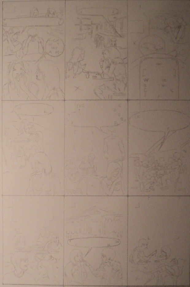 Y para los que echen de menos mis dibujos, no se preocupen. En el quinto número de la antología, centrado en temas románticos, aparecerá una historia escrita por Cal Cleary y dibujada por mí. A continuación va, entonces, la primera página en una versión preliminar a lápiz, seguida de la versión previa al paso de tinta, la versión entintada, y finalmente la versión definitiva que incluye algunos retoques digitales y las letras.