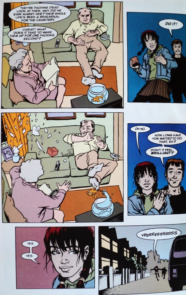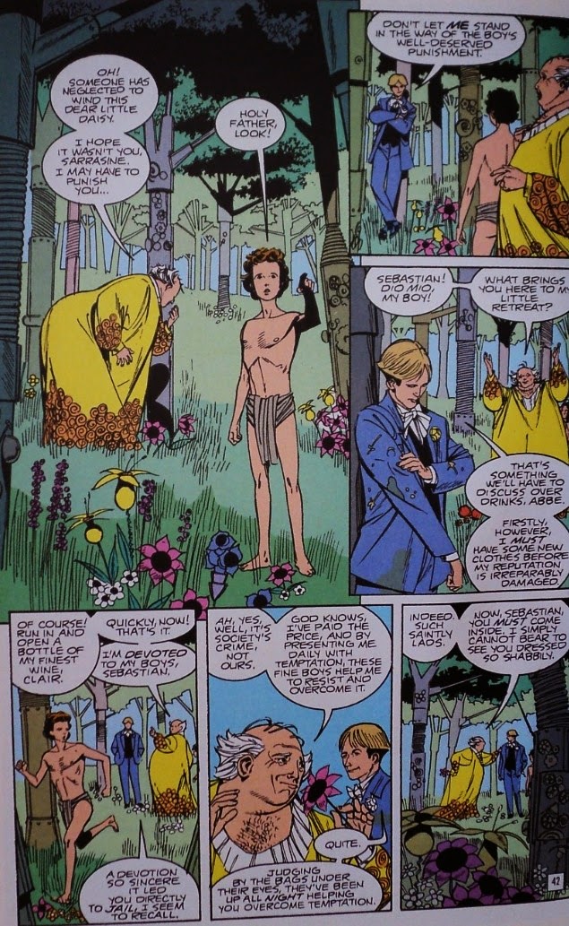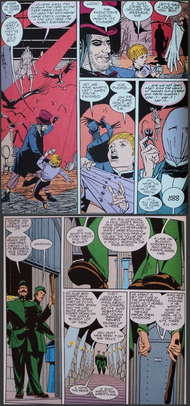 Let’s remember also that Apollonian art follows certain parameters: simple lines, sobriety, clear architecture; all fundamental traits of a man of distinction. These elements have also inspired an artist like Steve Yeowell to look for simplicity, cleanliness and tidiness in his pages (Steve Yeowell had worked before with the author in their seminal series on 2000AD’s Zenith, a very different story about a super-powered teenager in the “real” world). Finally, art’s goal would be to transform existence into beauty; Sebastian O, a dashing young man, takes the concept of the dandy to its logical outcome: elegance is not a virtue but a duty; to have a refined taste is not optional but mandatory.