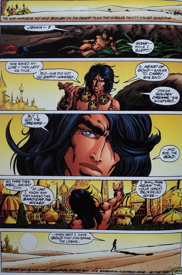 Although he barely knows her, Conan risks his life entering into the temple and attacking this dark creature which is, in fact, a monstrous, giant bat. After a savage fight, Conan saves Jenna’s life and manages to kill the beast just outside the city, but he’s left unconscious. When he wakes up he makes a startling discovery: “Dream golden dreams, she whispered. But I got the dreams--- and she, the gold. So fare thee well, ancient city. At last I know why they named thee Shadizar the Wicked. I shall pass again thru your great bejeweled gates--- when next I have gold that can spare the losing”. Injured, without sword or horse, and robbed of his gold, Conan continues his journey, even if he has to do so on foot.