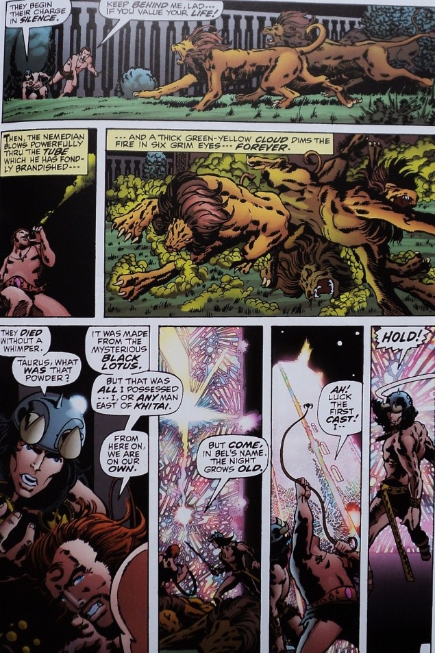 Unlike Conan, Taurus has prepared himself for this mission months in advance. He exterminates the mute lions of the garden with a powder made of the black lotus, a venomous plant of the exotic eastern regions; he also has enough tools to escalate the towers. Conan and Taurus decide that the best option for them is to work together, and since there will be more than enough gold and jewels for an entire army they won’t have problems in sharing the loot.