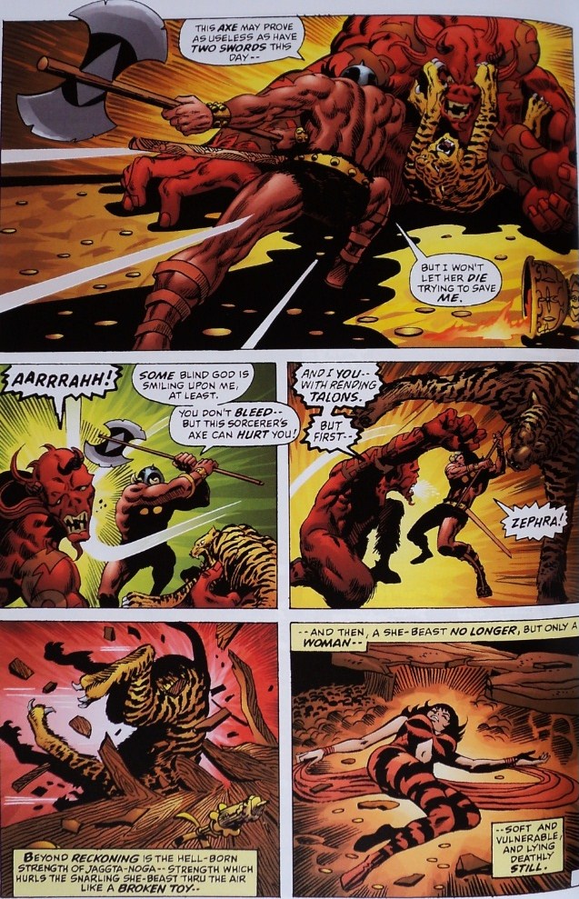 Zukala is prouder than Croesus: he’s immortal and powerful, he has more gold and jewels than anyone in Zamora, and he lives happily with his daughter Zephra. But pride, again, will turn into his doom. As Conan fights valiantly against the demon Jaggta-Noga and then against Zukala himself. The brutality of the Cimmerian’s attack overwhelms the immortal man, and when Zephra reveals his father’s weakness Conan strikes savagely.