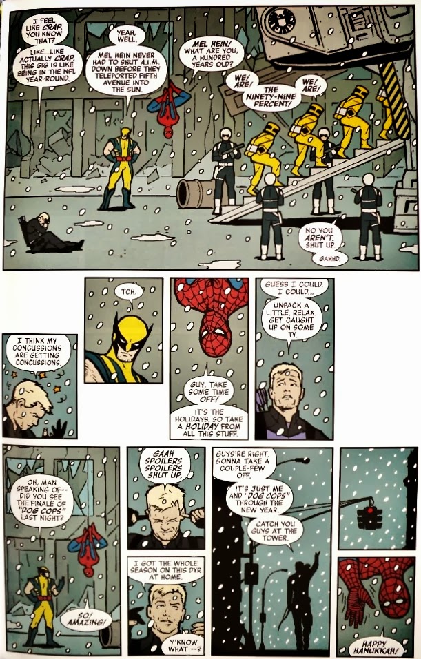 El triunfo de Hawkguy se apoya en dos premisas: una sensibilidad retro que se traduce en una estructura narrativa muy amena y la naturaleza episódica del título. A diferencia del centenar de cómics Marvel que vemos cada mes, Hawkeye nunca –ni siquiera una sola vez– cae en la trampa del arco argumental de 6 números. Al contrario, la mayoría de los números son aventuras auto-conclusivas, que pueden disfrutarse independientemente de las demás. De hecho, la saga más grande del primer volumen es "La cinta" (con ilustraciones de Javier Pulido), que abarca dos números. No puedo recordar la última vez que vi a alguien haciendo una historia en dos partes. Es algo que ya no se ve hoy en día. Todos los escritores deberían olvidarse del arco argumental de 6 números, tal como lo hace Fraction.