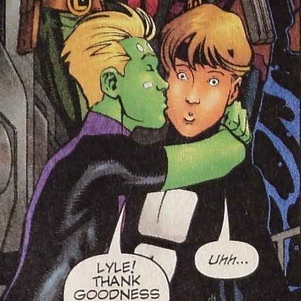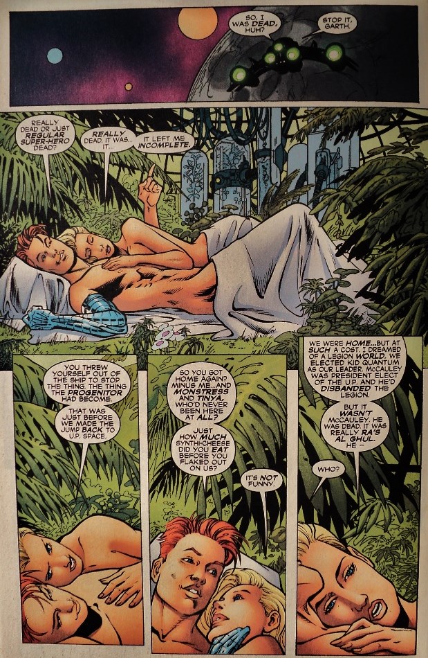 Hay un montón de elementos traviesos en “Limpieza”; Abnett y Lanning muestran con mucho humor lo que sucede a puertas cerradas, aunque sin la necesidad de ser explícitos. Los protagonistas descubren que Cosmic Boy y Kid Quantum están teniendo relaciones sexuales tan violentamente que los poderes magnéticos del chico se salen de control, e incluso los elementos metálicos que están fuera de la habitación empiezan a moverse hacia arriba y abajo, siguiendo el ritmo del acto sexual. Otro momento brillante es la “revelación” del secreto de Brainiac 5: su colección oculta de imágenes holográficas... específicamente seleccionadas para su (solitaria) satisfacción sexual. Él es un científico eternamente solitario, encerrado largas horas y a veces días enteros en el laboratorio, aislado, así que es comprensible que Brainiac 5 encontrase alivio en el onanismo compulsivo. Supongo que sólo los escritores británicos tendrían el valor de hablar abiertamente sobre la sexualidad de los jóvenes héroes. El dibujante de este número es Keith Giffen, famoso por su trabajo en la Legión de Super-Héroes en los 80s, y uno de los artistas más respetados de la industria norteamericana; el entintador es Al Milgrom, quien complementa de modo ideal las estilizadas líneas de Giffen.
