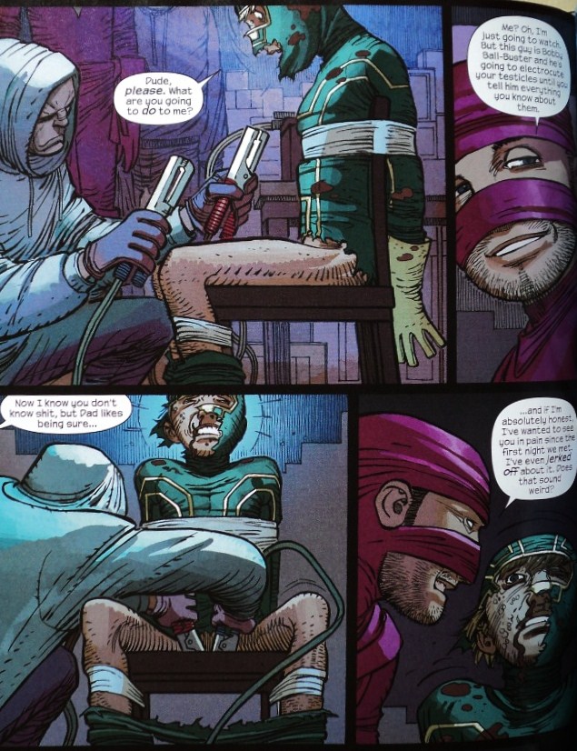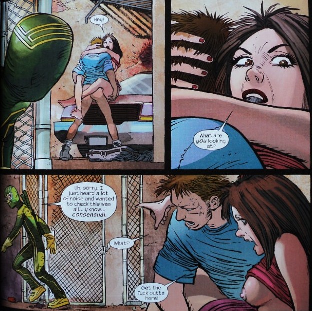 In one short and hilarious dialogue, Millar gives a rather accurate diagnosis on superheroes. Why do they spend their lives dressing up and punching the hell out of delinquents? Like Valerie says “Maybe it was all just sexual repression and your energy is used elsewhere these days”. For the first time in his life, Dave is happy. Like Freud said once, neurosis is a consequence of sexual repression. And if every superhero in the world should follow Dave’s example, their mental problems would be solved at once.