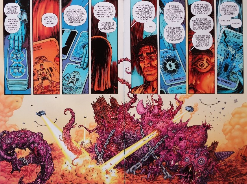Después del rotundo éxito de “Arkham Asylum”, Grant Morrison regresaría a Batman en “Gothic”, descrito como un “romance en cinco volúmenes”. El primer capítulo, “El hombre sin sombra” (publicado en Legends of the Dark Knight # 6, abril de 1990), presenta a un nuevo antagonista, a la vez que se centra en el lado más desagradable de la ciudad de Batman: “La ciudad de Gotham es el infierno. Todos estamos en el infierno. Y yo soy el rey del infierno", grita un enojado Batman. Estas no son palabras vacías. Ciertamente, a juzgar por las ilustraciones casi infernales inventadas por la efervescente imaginación de Klaus Janson, tendríamos que creer que cada palabra pronunciada por el cruzado enmascarado es absolutamente cierta.