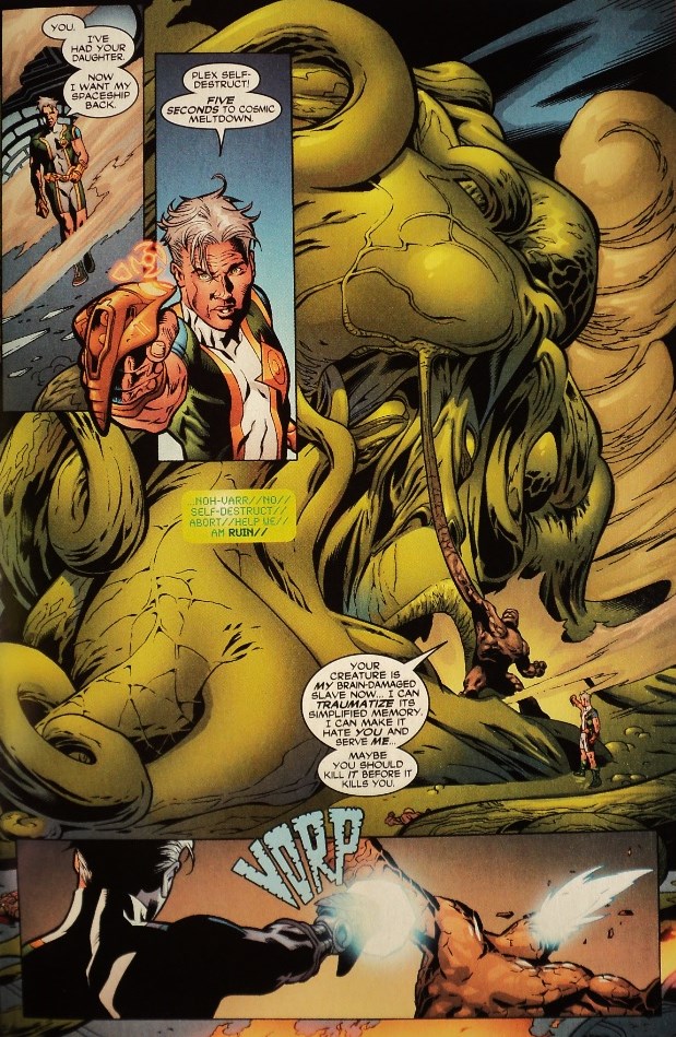 Mi historia favorita en Weird War Tales # 3 (agosto de 1997), es “Nuevos juguetes” gracias al guión loco y muy original de Grant Morrison y al impresionante y detallado arte de Frank Quitely. Mucho antes de que estos dos creadores dejaran huellas imborrables en series tan populares como New X-Men o Batman, ya eran un equipo creativo excepcional con capacidad para cautivar a todos los lectores. Aquí la guerra tiene lugar entre juguetes, y cuando una figura de acción/soldado/desertor sobrevive a una masacre espantosa, encuentra a la muñeca Barbie por excelencia, que cuida de él. Pronto, se enamoran y comienzan a experimentar con la posibilidad del sexo además del travestismo. “Nuevos juguetes” es simplemente fabulosa y, por mucho que me hizo reír, también aplaudo su aterrador final.