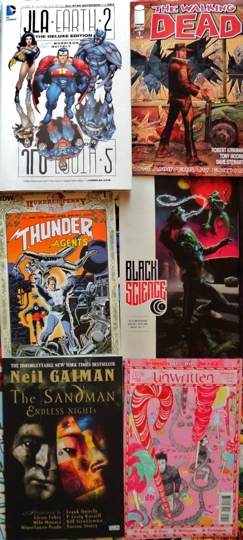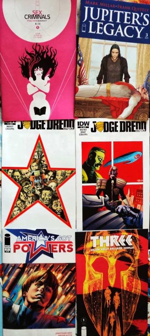 Mientras ustedes estaban celebrando Halloween, yo era un feliz prisionero de una verdadera montaña de buenos cómics. Algunos fueron simplemente buenos (Night of the Living Dead, New Mutants), otros fueron muy buenos (Thor: God of Thunder) y otros fueron una obra maestra (Sandman: Endless Nights). Recibí una maravillosa dosis triple de Quitely: Sandman: Endless Nights (es tan grandioso que tenía que mencionarlo al menos dos veces), Jupiter’s Legacy (le dedicaré un post dentro de poco) y Earth 2 (la historia de Morrison es muy impresionante y las páginas de Quitely son preciosas). No había leído ningún cómic bueno de Jeph Loeb en la última década, pero disfruté con estos números de Nova, no sé si el protagonista (Sam) es un homenaje de Jeph a su propio hijo fallecido (Sam Loeb), pero ciertamente me gustó la idea de un chiquillo que sigue el ejemplo de su padre (en la vida real Sam Loeb escribió cómics al igual que su padre). Me divertí con la reimpresión del clásico Thunder Agents de Wally Wood. Y me aburrí con los Ultimate X-Men de Wood. Pero si sólo hablara de nuevas entregas, probablemente lo que más disfruté este mes fueron los primeros números de Three (Gillen rápidamente se está convirtiendo en uno de mis nuevos escritores británicos favoritos) y Sex Criminals (de lejos, mi creación original favorita de Matt Fraction... no sé por qué, pero me decepcionó mucho el Casanova de Fraction y su Satellite Sam; y por mucho tiempo pensé que él solamente era bueno escribiendo Iron Man, FF o Defenders para Marvel pero resulta que Sex Criminals es una serie brillante con un concepto muy seductor). Y ahora, sin mayores preámbulos, ahí van los cómics de octubre.
