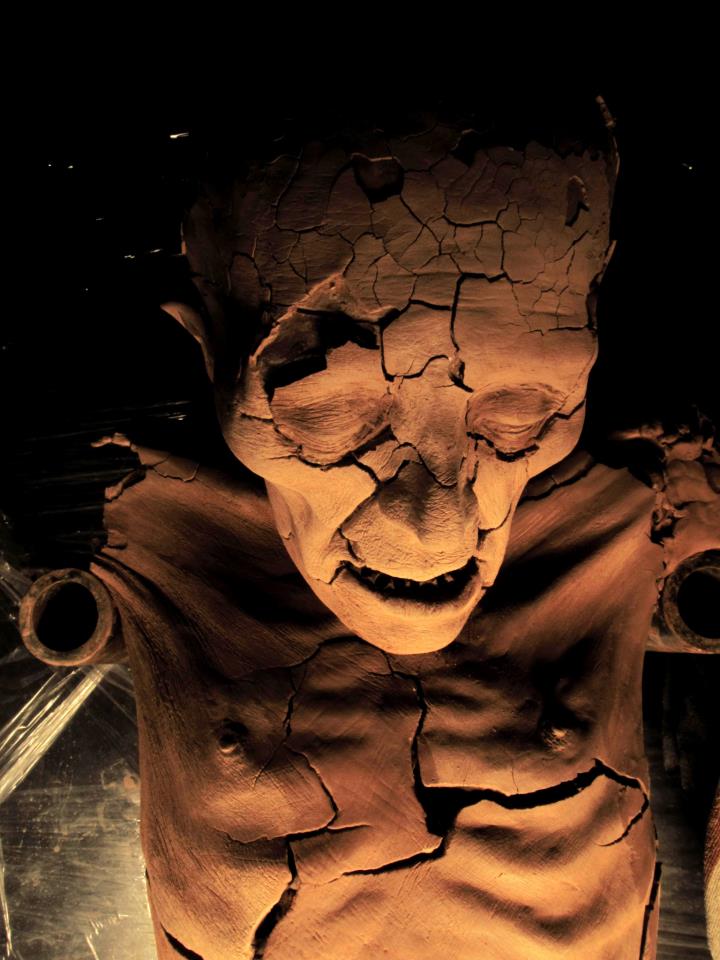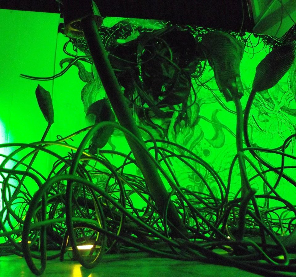 Quedé especialmente sorprendido con las dos esculturas de Aldo Romero Scattolon; la primera presenta un cadáver y ha sido construida usando un esqueleto humano real, que a su vez está recubierto de arcilla; el color ocre de este material se desprende en ciertas zonas del cuerpo, dejando al descubierto el huso crudo, y creando así la sensación de estar ante un “hombre desmoronado”, una figura muerta que se descascara, que se pudre tétrica pero inodoramente, tras una urna de vidrio; el hecho que esté de pie y con la cabeza agachada le confiere aún mayor impacto a esta pieza escultórica de casi dos metros. Un trabajo insuperable, que se complementa muy bien con la segunda escultura de Aldo: una columna clásica, de yeso, similar a las que vemos en edificaciones limeñas de fines del siglo XIX, derruida, con trozos enteros que se han caído y estrellado contra el piso, haciéndose añicos. Al interior del pilar hay una especie de columna vertebral, hecha con residuos de maquinarias, el trabajo de ensamblaje es notable, y juega con la repugnancia que provocaría en nosotros una materia teguminosa y viscosa –similar, quizás, a la del Alien de HR Giger– y con la idea de restos oxidados y retorcidos de una máquina ahora inservible. Realmente son dos esculturas fascinantes y una sola propuesta artística que va más allá de la convencional manía decorativa de otros escultores.