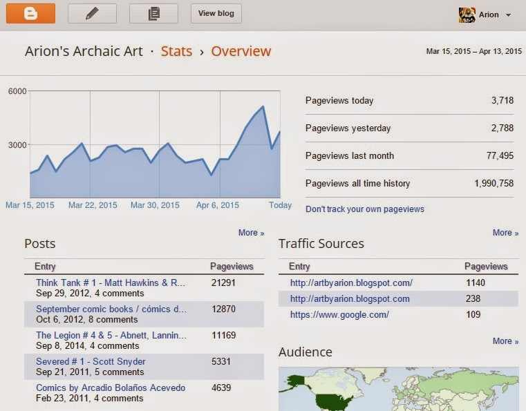 The following graphic, “pageviews by countries”, reveals facts that I was already aware of in the past. Last month, my blog received over 57,000 visits from the United States. Now that’s a very good sign, since most of the ads from Project Wonderful (which you’ve been seeing on my blog since March 2014) usually take into account only clicks that come from the United States. That means that the 6,000 visits that I get combining France and Germany do not amount to much when it comes to publicity earnings. It’s quite peculiar to see Russia so high up on the list of countries (I can’t imagine how they manage to read my posts, being familiar only with the Cyrillic alphabet). It’s hard to believe that I get more visits from Ukraine and Poland than from the United Kingdom. I guess in the near future I shall start reviewing more Judge Dredd and 2000AD comics (that should increase the click count from UK). Weird as it may seem, more people in India read this blog than here in Perú, my own country. How odd is that?