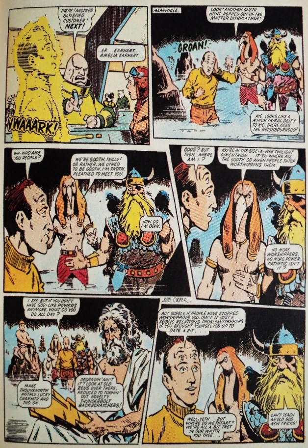 “A medio camino del paraíso” (“2000 AD” # 245, 1982) le permite a Moore explorar más a fondo la naturaleza de las deidades; cuando Abelard Snazz se pierde en un agujero negro, termina conociendo a los dioses de las culturas antiguas. Fracasados e impotentes después de haber perdido a sus adoradores hace miles de años, Zeus, Thoth y Odín finalmente aceptan la ayuda de Snazz; él promete crear una campaña de relaciones públicas que hará que los dioses sean populares otra vez. El talentoso John Cooper crea secuencias bastante impresionantes, y sus dioses se ven estupendos.